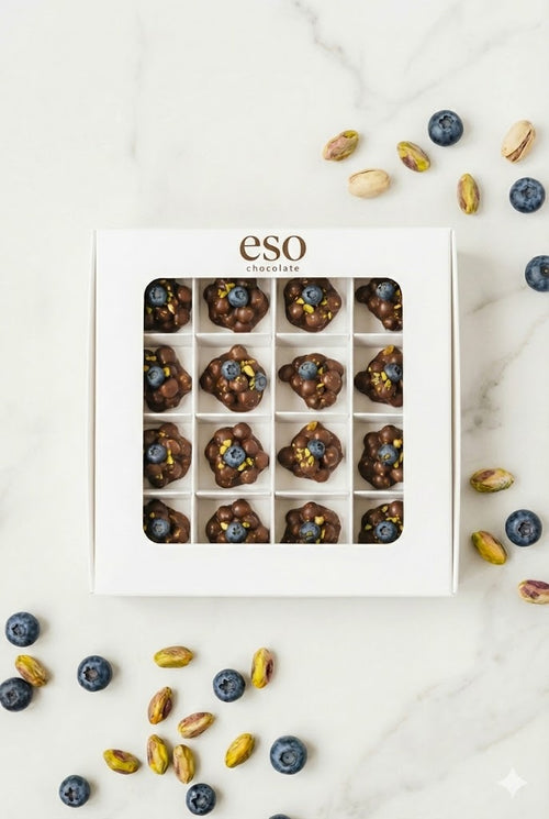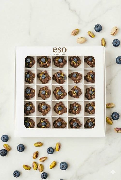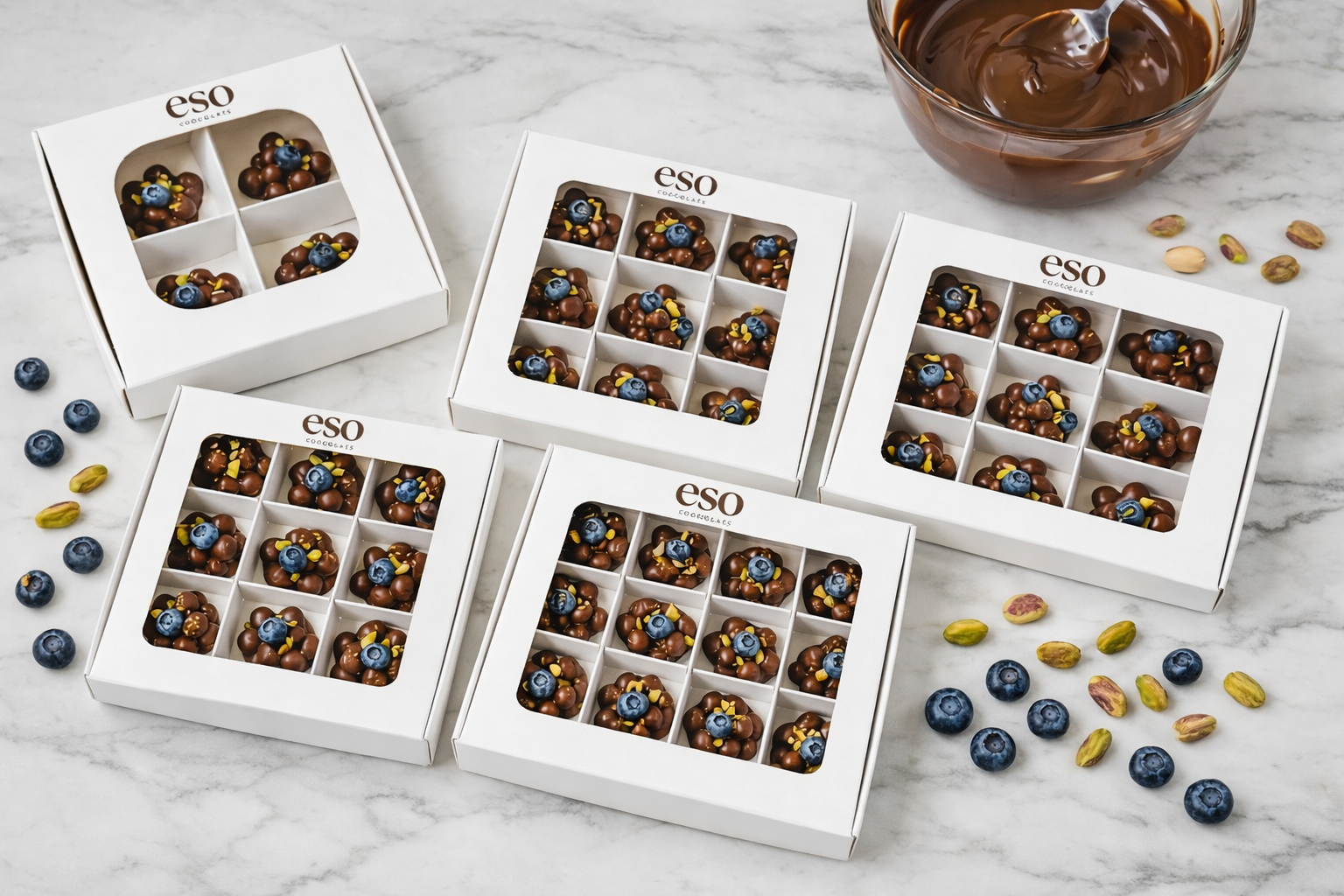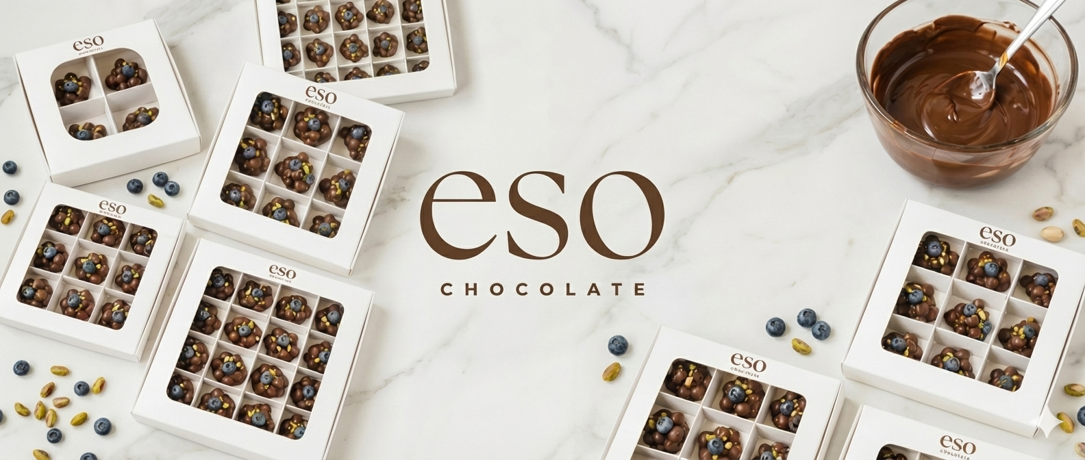 At eso, we choose the best fresh fruits — sweet berries, soft dates, and ripe figs. We fill them with fresh cream and roast nuts. Then, we dip them in artisan chocolate.